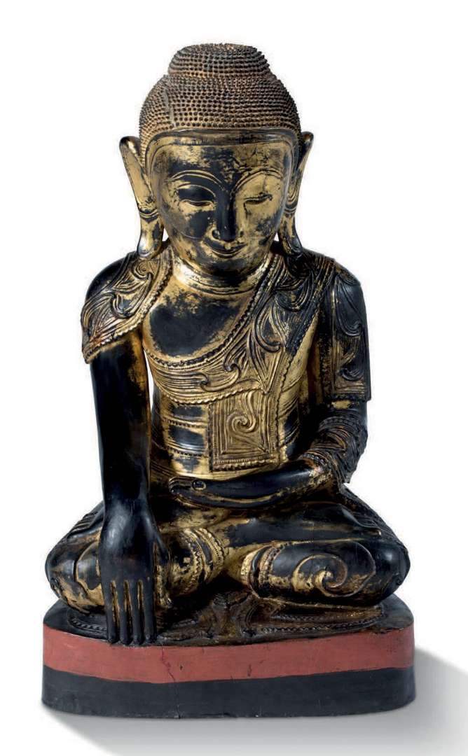 Statue de style Shan en bois laqué doré figurant le Bouddha Maraviyaja, assis en padmasana, les mains en bhumiparsha mudra, vêtu d'une fine robe monastique soulignée par des ourlets mouvementés.