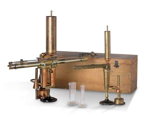 Ébullioscope de haute précision, système A. Contassot, type 1914, permettant le dosage de la richesse alcoolique des vins et autres liquides alcooliques. Laiton, cuivre et verre. Dans sa boîte en bois estampillée avec éprouvettes et notice.