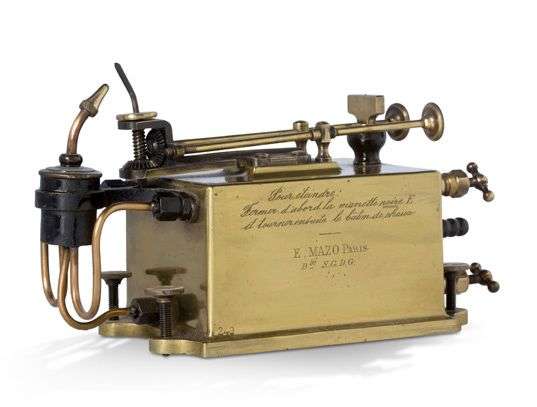 Lampe oxyéthérique en laiton, cuivre et métal, l'un des côtés signé avec instructions d'utilisation.