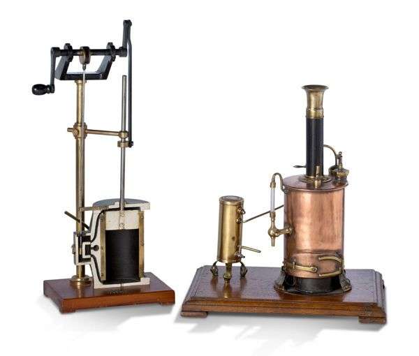 Machine à vapeur à chaudière verticale en cuivre et laiton, sur socle en b