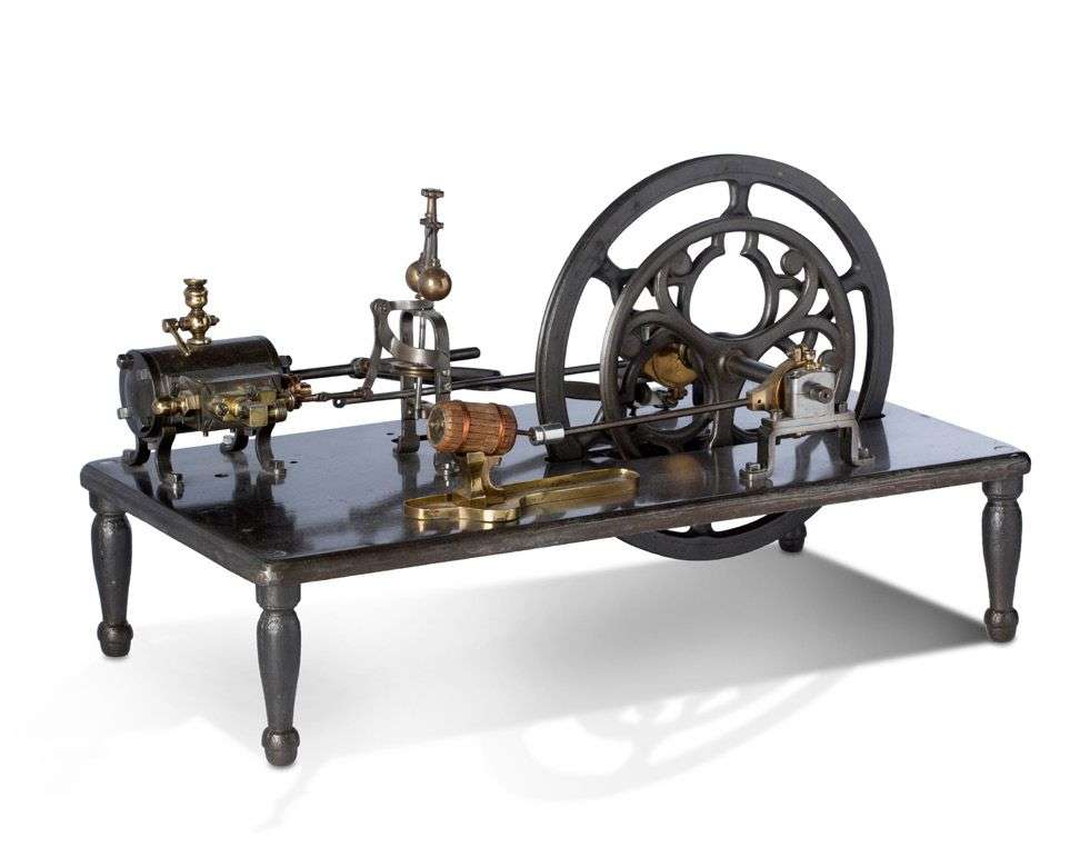 Moteur de machine à vapeur en acier, fonte et laiton à piston oscillant, reposant sur un plateau à quatre pieds balustres.