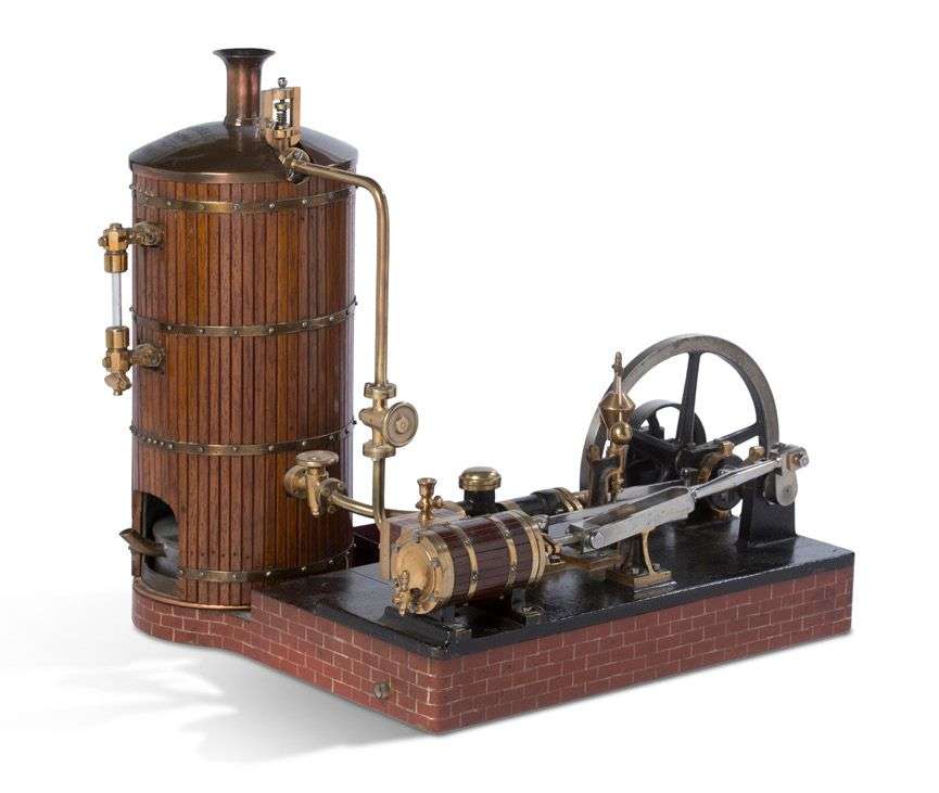 Belle machine à vapeur à chaudière verticale signée « J. Jobard / 1890 / Modeleur », moteur latéral à piston oscillant en acajou, acier, fonte et métal, le socle en bois peint à l'imitation de briques.