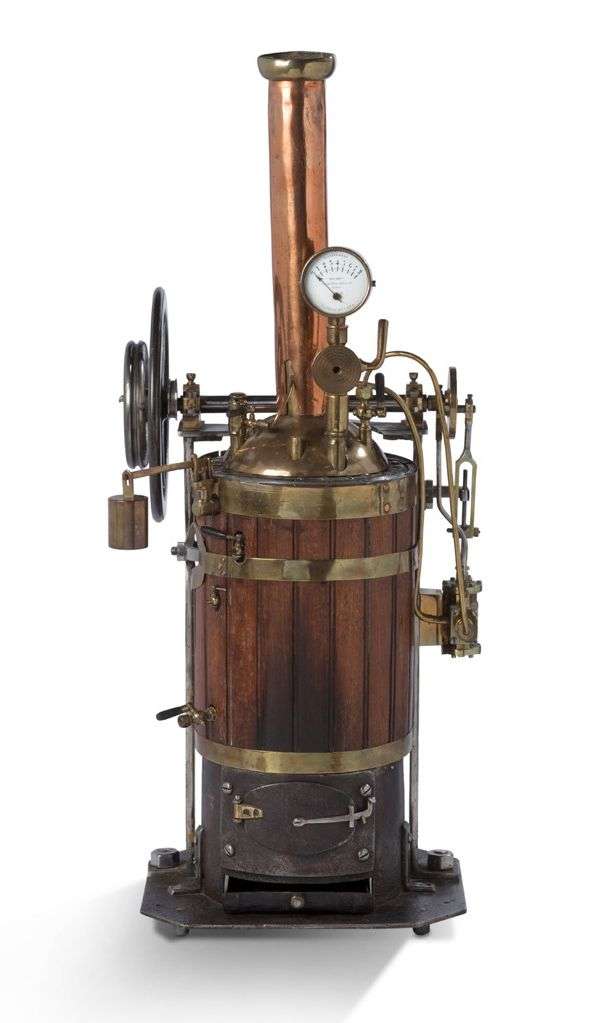 Importante machine à vapeur à chaudière verticale en acajou, fonte, acier,