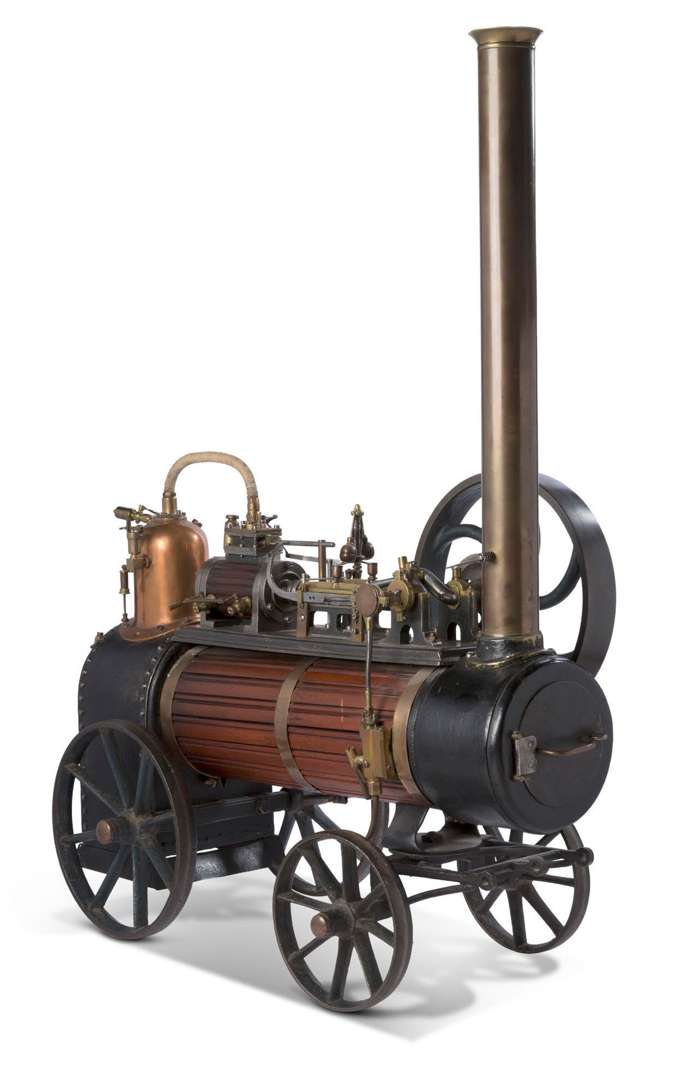 Belle locomobile à vapeur en tôle, acier, laiton et cuivre, le cylindre fixe en acajou.