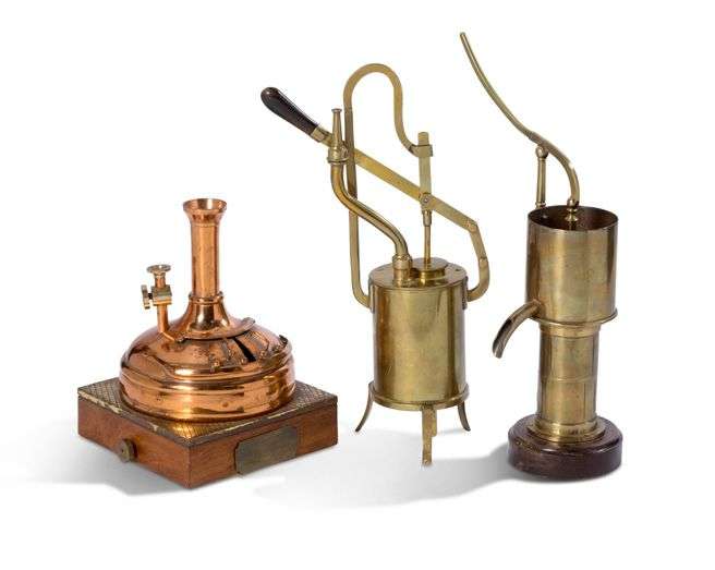Une petite cuve de brassage en cuivre et deux pompes ou pressoirs en laiton, l'une signée « Scheinlein ».