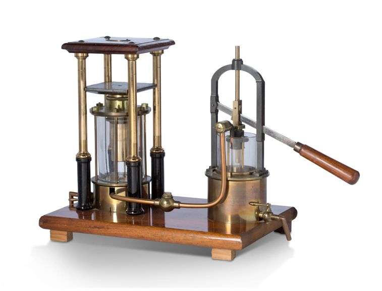 Belle maquette de presse hydraulique composée de deux corps de pompe cylindriques communiquant par un tube.