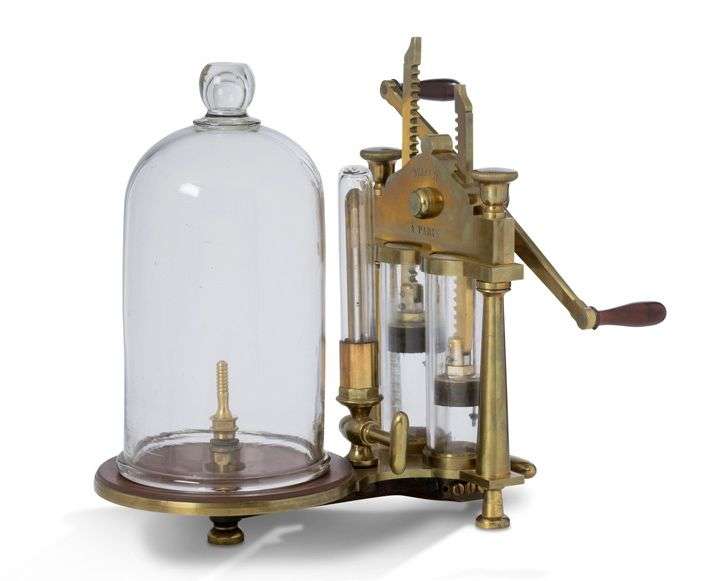 Pompe à vide ou machine pneumatique pour expériences sur le vide. Elle présente deux corps de pompe cylindriques en verre, un thermomètre, une cloche en verre et est signée « Deleuil à Paris ».