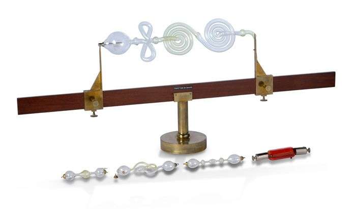 On y joint : une ampoule à verre rouge et un grand tube de Geissler accidenté sur un présentoir