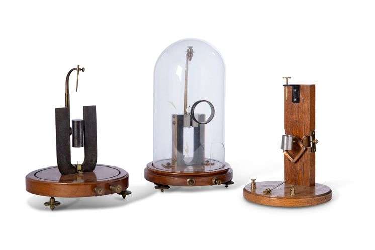 Réunion de de trois galvanomètres DEPREZ D'ARSONVAL l'un sous cloche en ve