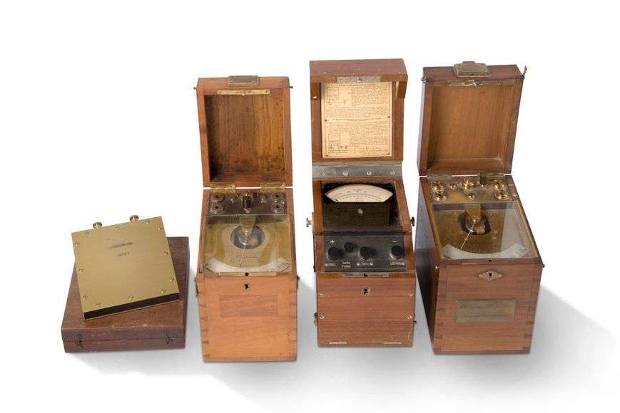 Deux ohmmètres signés « J. Carpentier à Paris » dans leurs coffrets en bois, n° 7218-15 et 8802-8 et un condensateur n° 1529 N-7 dans son coffret en acajou.