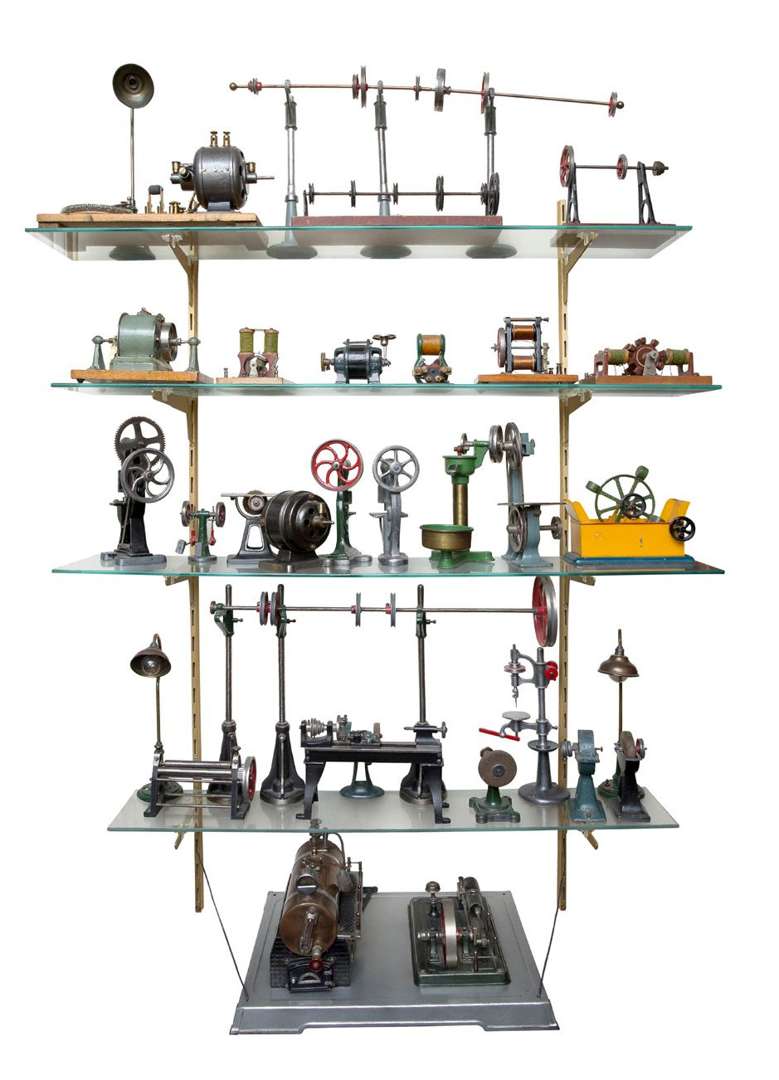 Importante usine miniature électrique composée d'environ une vingtaine de pièces, machines et accessoires dont une chaudière à vapeur à piston oscillant latéral, divers moteurs, lampadaires, tours, scie, rouages, meules, fontaine, moulin...