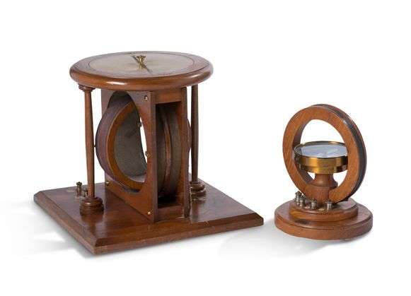 Réunion de deux boussoles des tangentes ou galvanomètre en bois et métal,