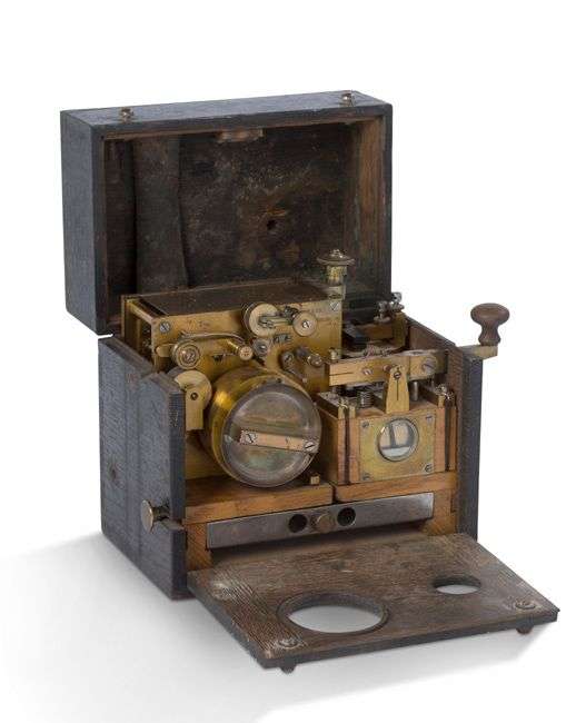 Télégraphe militaire en laiton signé, n° 3538, dans sa boîte en bois noirci.