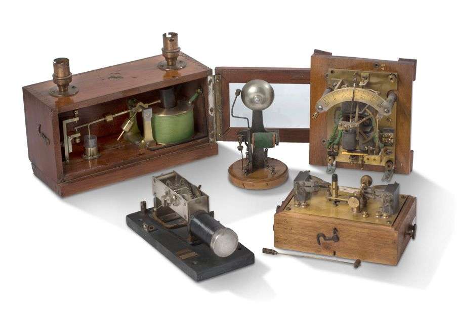 Réunion de cinq appareils électriques certains pour télégraphe, comprenant