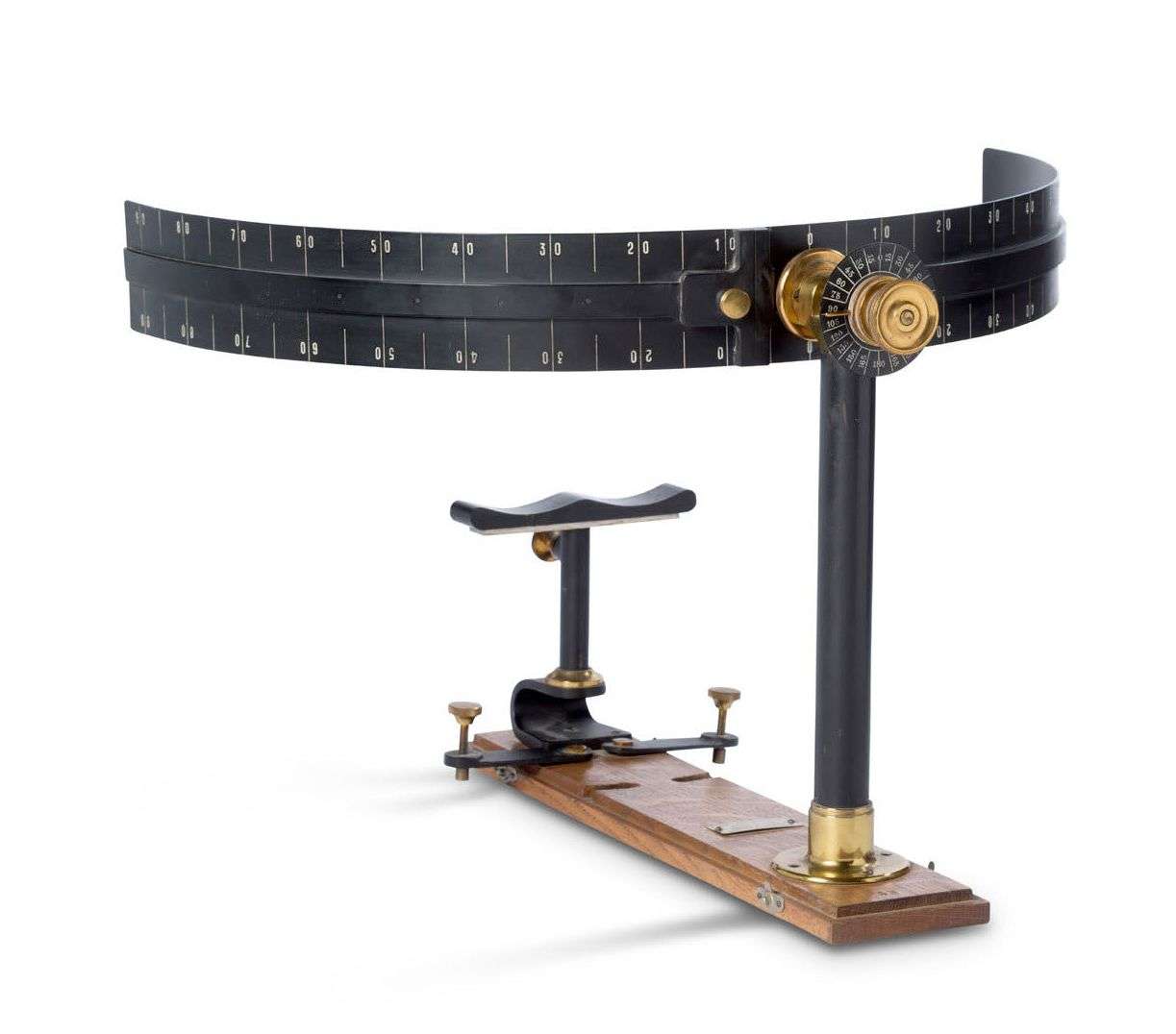 Périmètre du Dr Landolt pour la mesure de la périphérie du champ visuel, en laiton et métal noirci composé d'un arc de cercle à double graduation de 0 à 90° tournant sur un axe, socle en chêne portant la plaque du fabricant.