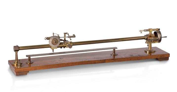Dynamomètre sérimètre horizontal ou détorsionneur de fils de soie, en laiton et métal sur socle en bois, plaque du fabricant, n° 1005.