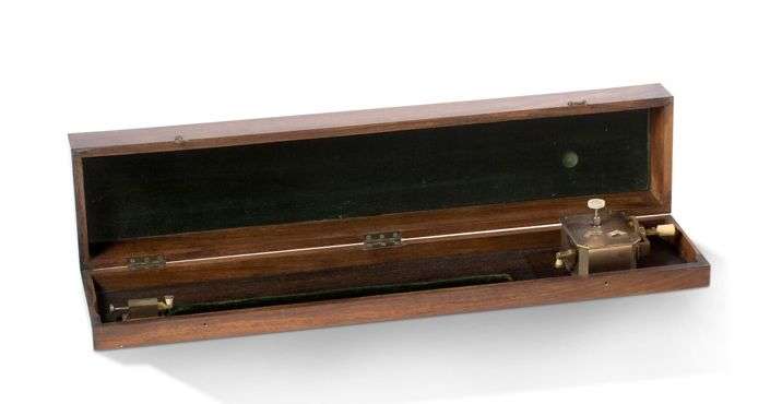 Dynamomètre sérimètre horizontal ou détorsionneur de fil de soie en laiton, la platine signée, dans sa boîte en acajou verni.