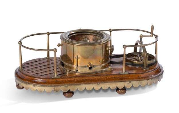 En laiton et acajou verni, le plateau ovale à ceinture festonnée, rembarde et manivelle latérale, présente un côté quadrillé et repose sur six pieds en boules aplaties.
