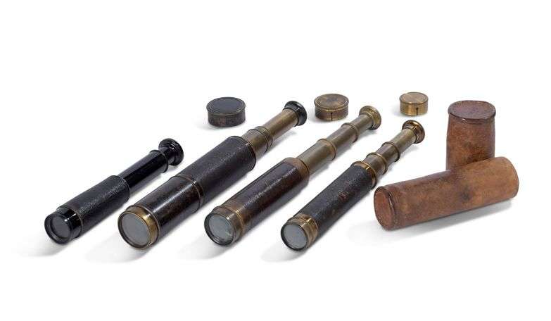 Réunion de quatre longues vues en laiton et métal gainé de chagrin noir, l'une signée « Maison de L'Ing Chevallier Opt / Place du Pont-Neuf 15 / Paris », une autre signée « Hermagis Paris ».