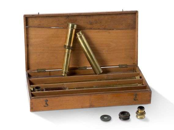 Un lot d'oculaires et objectifs de lunettes en laiton et verre, dans un coffret en bois.