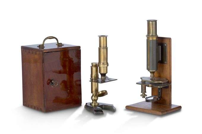 Réunion de deux microscopes en laiton, l'un sur support en bois, l'autre avec pied en fonte dans une boîte en acajou.