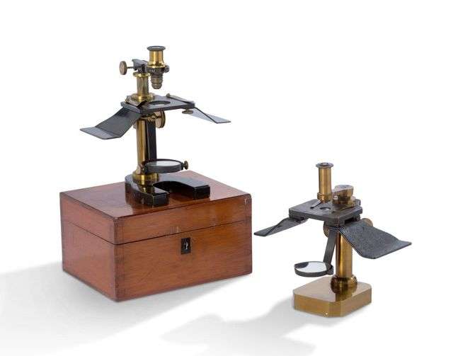 Réunion de deux microscopes composés en laiton et métal noirci, avec porte