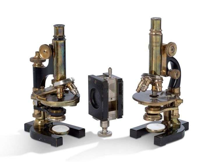 Suite de deux microscopes composés en laiton et métal noirci à quatre objectifs, signés « M. STIASSNIE / 204 Bould Raspail Paris ».