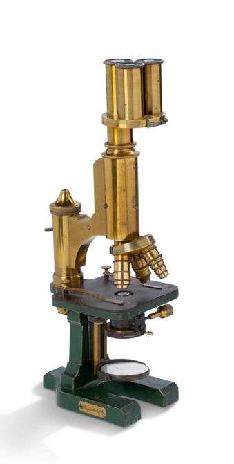 Microscope composé en laiton et métal noirci, à trois oculaires rotatifs et trois objectifs, le pied peint en vert avec plaque « Ges geschützt ».