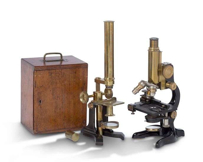 Réunion de deux microscopes composés en laiton et métal noirci, l'un signé « J. H. Steward / 63 St Pauls Church / Yard London », présenté dans sa boîte en acajou, l'autre à trois objectifs, signé « COGIT Paris ».