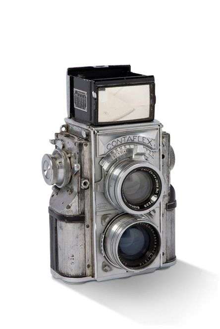 Boîtier Contaflex (grippé, revêtement avec manques) avec objectifs Carl Zeiss Jena Sonnar 2/5 cm et Sucher-Objektiv 2.8/8 cm.