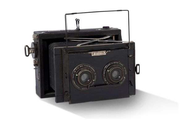 Chambre photographique stéréoscopique Nettel « E. Suter, Bâle, Manufacture d'Optique », format dépoli environ 8 x 13 cm) avec objectifs E. Sutter Basel Série III N° 0 5/100 mm.