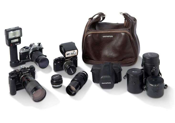 Boitier Olympus OM-1 avec objectif Sun Zoom 3.8-5.3/35-200 mm (impuretés) et moteur. Boitier Nikon chromé FM avec objectif Tampon 3.8 - 4/70-210 mm (champignons) et flash. Boitier Olympus OM2 noir avec objectif OM-System E. Zuiko Auto-T 2.8/100 mm (champignons) et flash Olympus. Est joint un sac Olympus contenant des boîtes pour objectif dont deux avec des objectifs Olympus (4/75-150 mm et 2.8/35 mm).