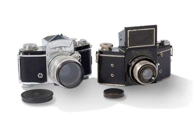 Boitier Exakta (noir) avec objectif Exaktar 3.5/7.5 cm et boitier Exakta Varex IIa avec objectif Carl Zeiss Jena Boîter 2/58 mm (usures, en l'état).