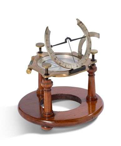 Cadran solaire équatorial en laiton avec niveaux à bulle et boussole, la platine gravée de latitudes de villes européennes. Socle tripode en acajou.