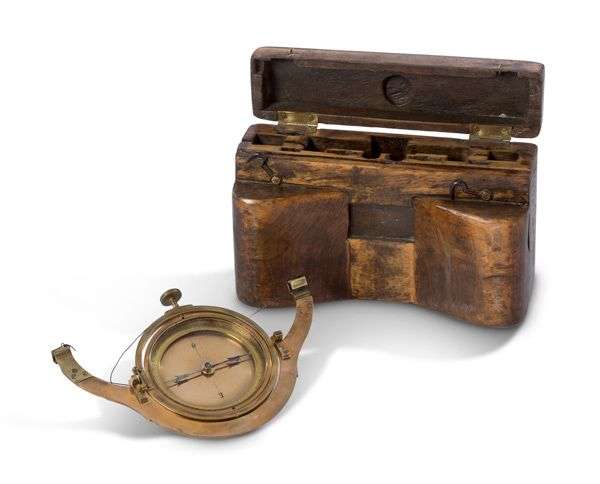 Pochette de mineur en bois comprenant une boussole suspendue en cuivre et laiton.