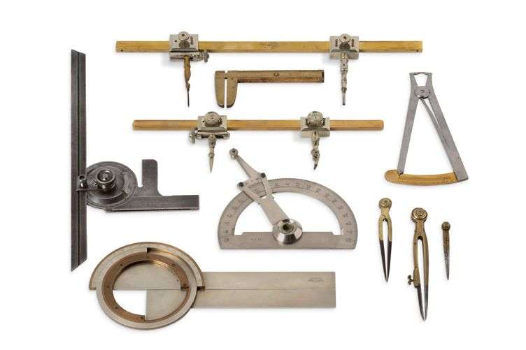 Réunion de dix instruments de mesure ou de dessin comprenant trois compas, un rapporteur à alidade mobile signé « RIEFLER », un compas de lapidaire, un pied à coulisse signé « RABONE England », une règle rapporteur signée « BARABAN Paris », une règle à cylindre ajustable signée « BROWN & SHARPE USA » et deux compas à verge.