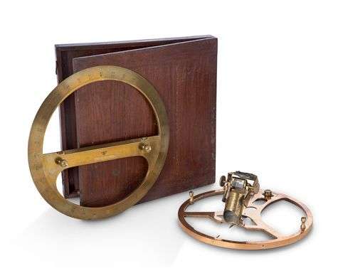 Rapporteur à cercle entier en laiton pour cartes terrestres, gravé d'une double graduation, l'une de 0 à 360°, l'autre en quatre secteurs de 0 à 90°, monogrammé « BN » dans un triangle. Dans son coffret en acajou.