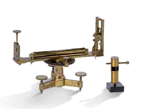 Niveau de pente à pinnules en laiton, piètement tripode à vis, niveau à bulle, signé « Bellieni à Metz ».