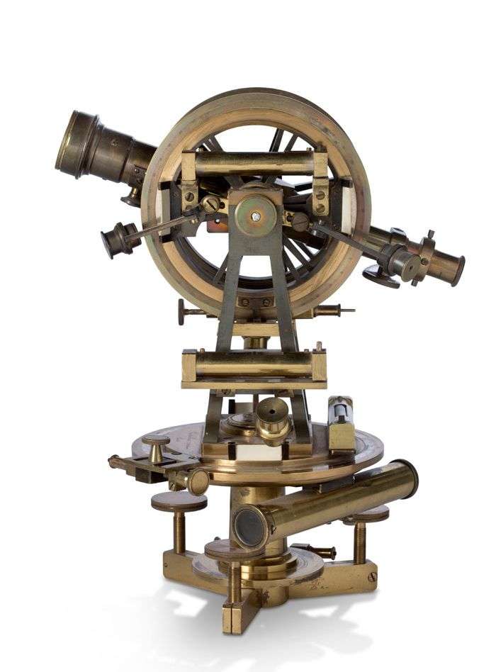 Théodolite en laiton et métal, le vernier en argent, niveaux à bulle, axe rotatif et piètement tripode, signé sur la platine « Barbotheu, 17 rue Béranger / Paris ».