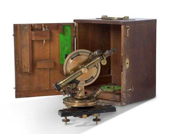 Théodolite simplifié en laiton et métal noirci, niveau à bulle, axe rotatif et piètement tripode, signé sur la platine « A. Hurlimann à Paris / 84 ». Dans sa boîte en bois avec accessoires.