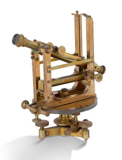 Tachéomètre autoréducteur de Sanguet en laiton, le limbe en argent gradué de 0 à 390°, niveau à bulle, la platine signée « Société des lunetiers constructeurs - Paris / Auto-réducteur / de J.B. Blanc Ingénieur - Limoges » reposant sur un piètement tripode.