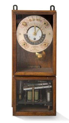 Le cadran présentant les heures du jour et de la nuit avec quatre minuteurs pour les 1er et 2e services de jour et de nuit, signé « J. COURTOIS PARIS Système breveté SGDG », minuterie avec ses ampoules.