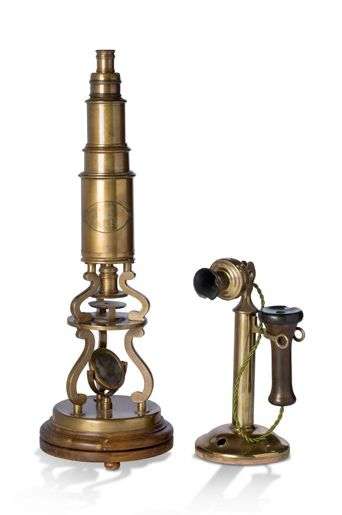 Un microscope de type Culpepper en laiton monté en lampe, signé « Thos Culpepper & Son / N° 10 Jeremy St / London », sur un socle en bois circulaire.