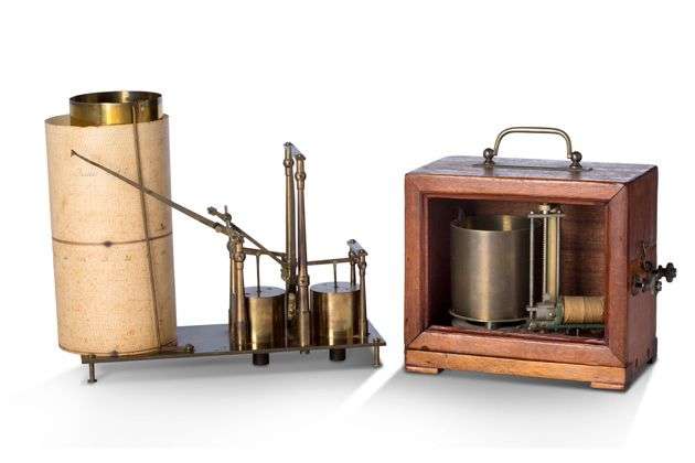 Réunion de deux sismographes en laiton, l'un dans son coffret en bois, les deux monogrammés.