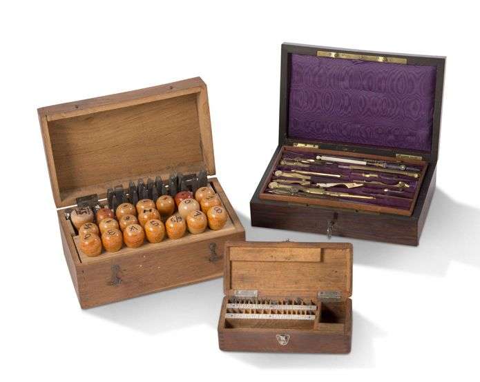 Réunion de trois boîtes de poinçons, cames et compas