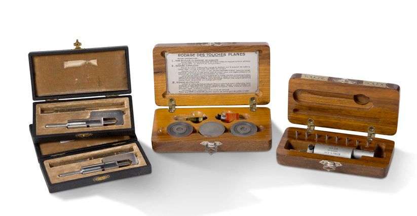 Un lot comprenant un kit de rodage des touches planes et trois instruments pour Solex dans leurs boîtes en bois avec accessoires.