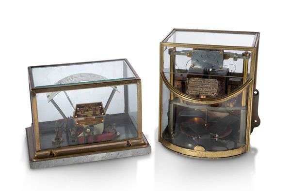 Deux compteurs électriques dans leurs cages en verre et laiton, avec plaques du fabricant,n° 469469 et n° 3603.