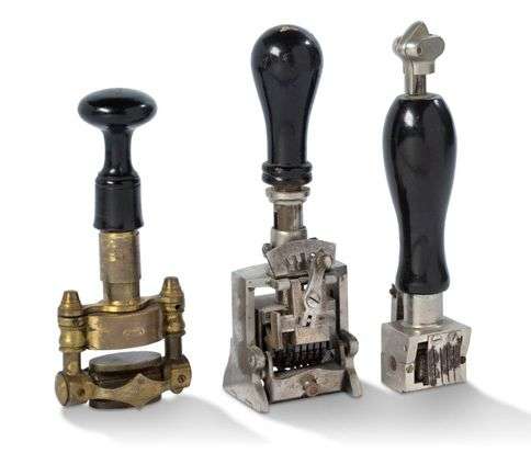 Réunion de trois tampons mécaniques comprenant deux tampons numéroteurs-dateurs et un tampon signé « HMC » en acier et laiton, manche en bois tourné noirci.