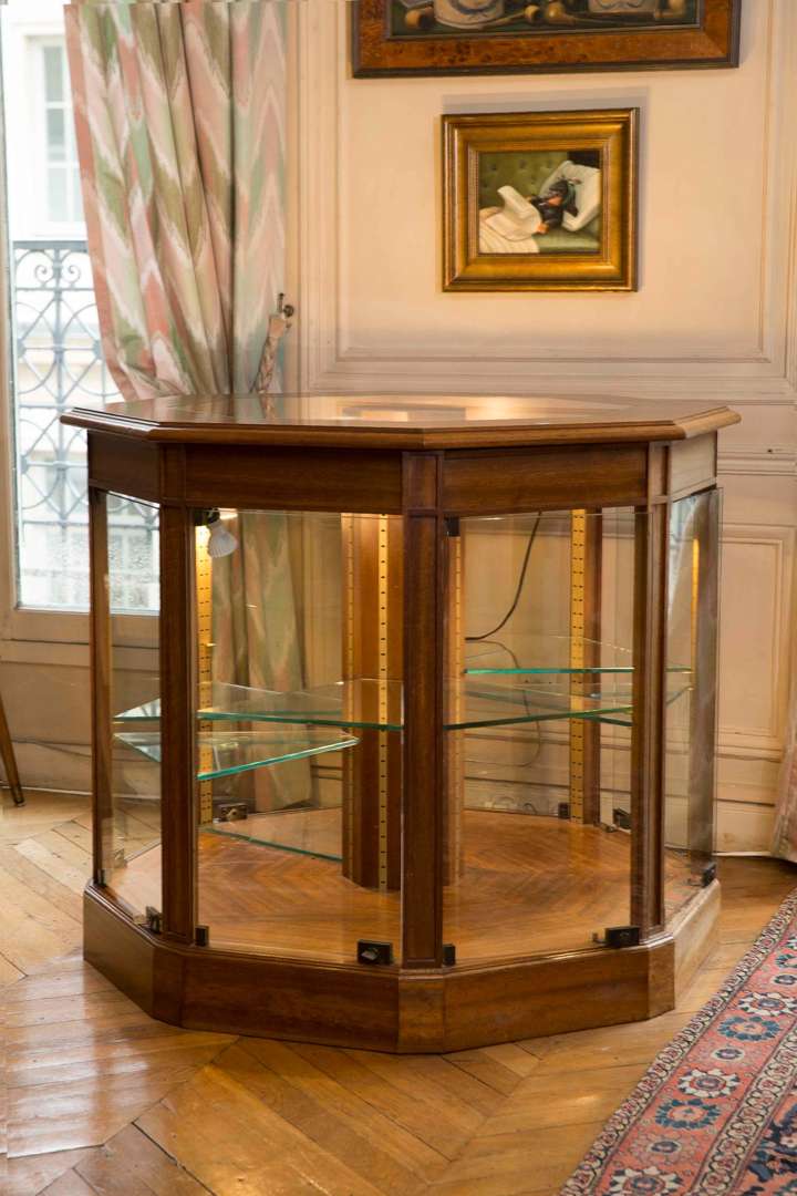 Deux vitrines octogonales en bois mouluré laissé au naturel, ouvrant à huit portes vitrées, avec étagères en verre modulables. Avec jeu de clefs.