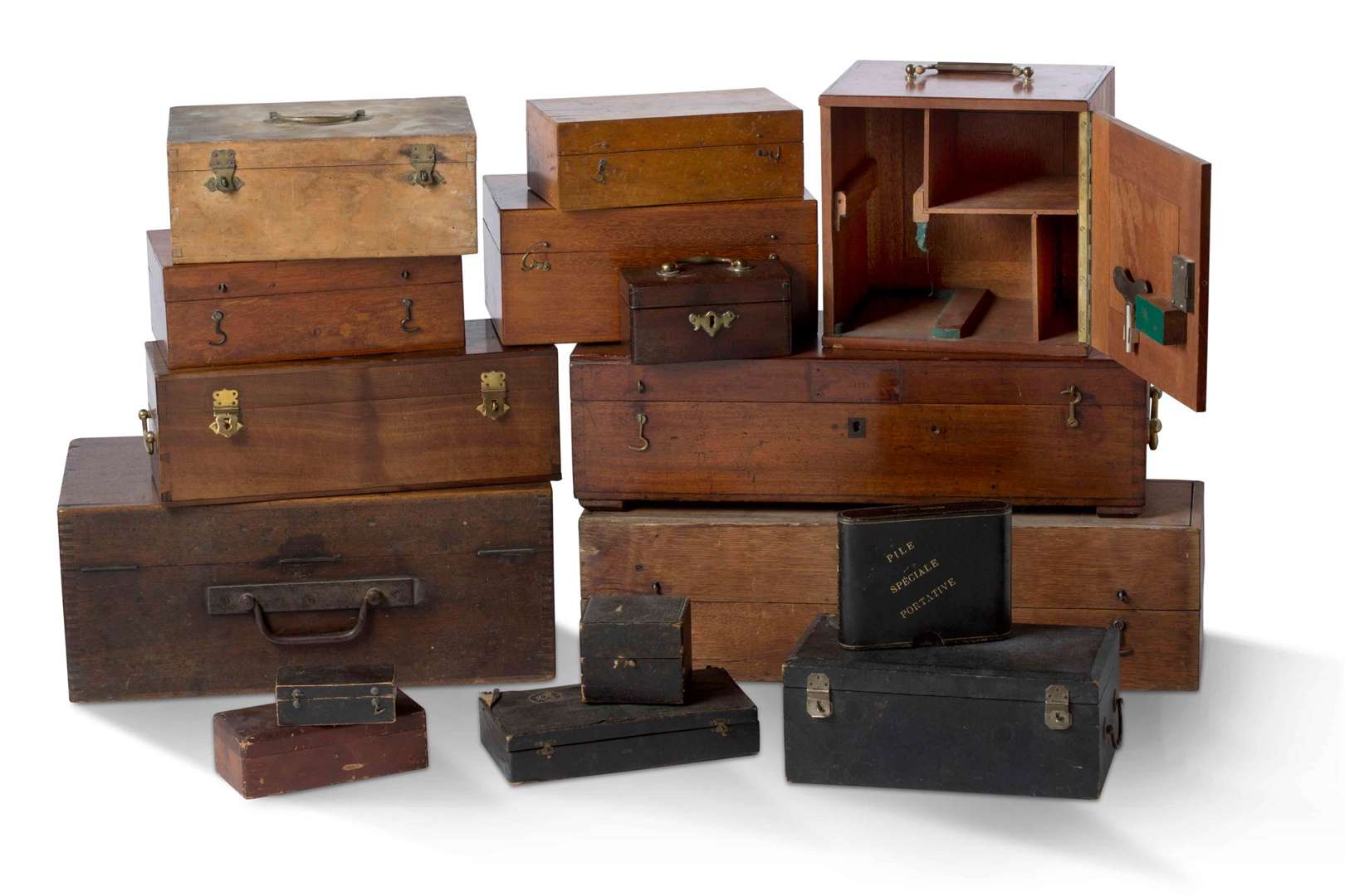 Réunion de boîtes et coffrets vides en bois, acajou, cuir et chagrin, pour objets scientifiques et instruments de mesure.